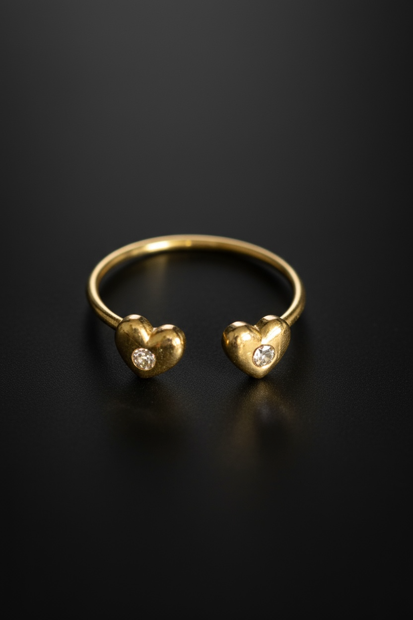 This stunning open ring features two polished golden hearts, each adorned with a sparkling diamond at its center. A perfect symbol of love and connection, this piece blends simplicity with timeless charm. Ideal for everyday wear or as a heartfelt gift for someone special.
