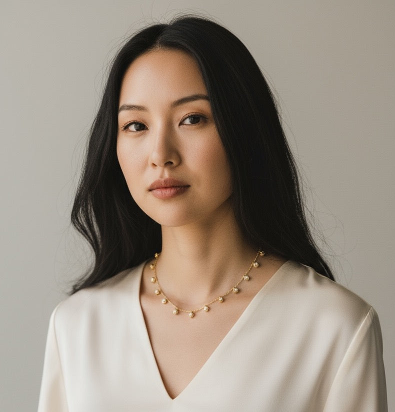 A delicate gold-toned necklace featuring dainty round charms, each adorned with a shimmering crystal. Perfect for layering or wearing solo for a minimalist, elegant look. Its timeless design makes it ideal for both everyday wear and special occasions.