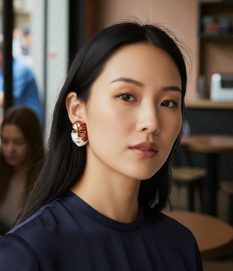 Add a touch of mystery and glamour to your look with these stunning Venetian-inspired mask earrings. Handcrafted with intricate red glitter enamel and gold detailing, these earrings bring an artistic and luxurious charm to any outfit. Perfect for festive occasions, parties, or elegant evenings.